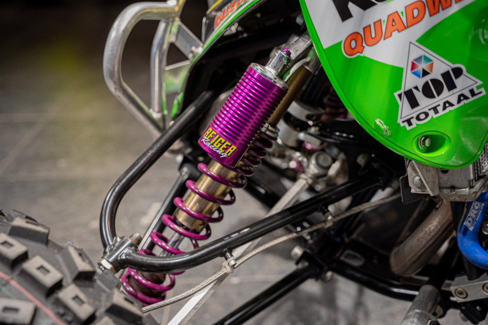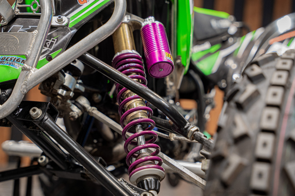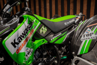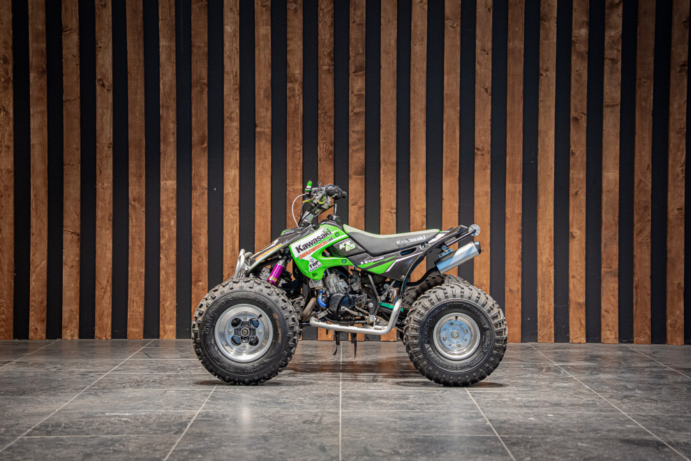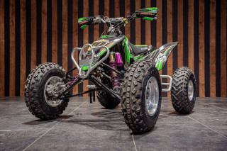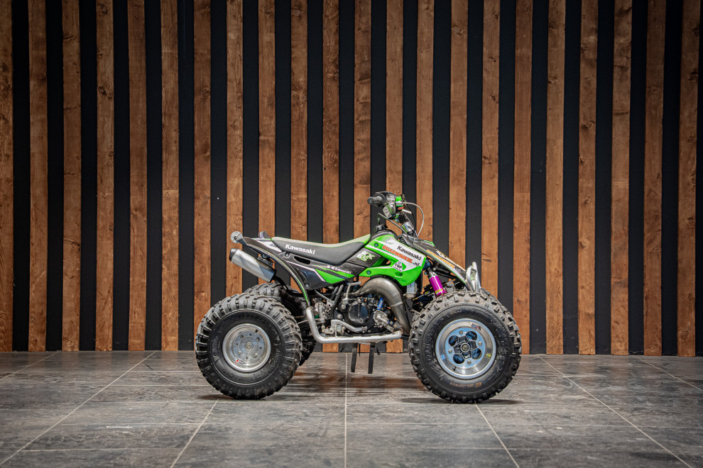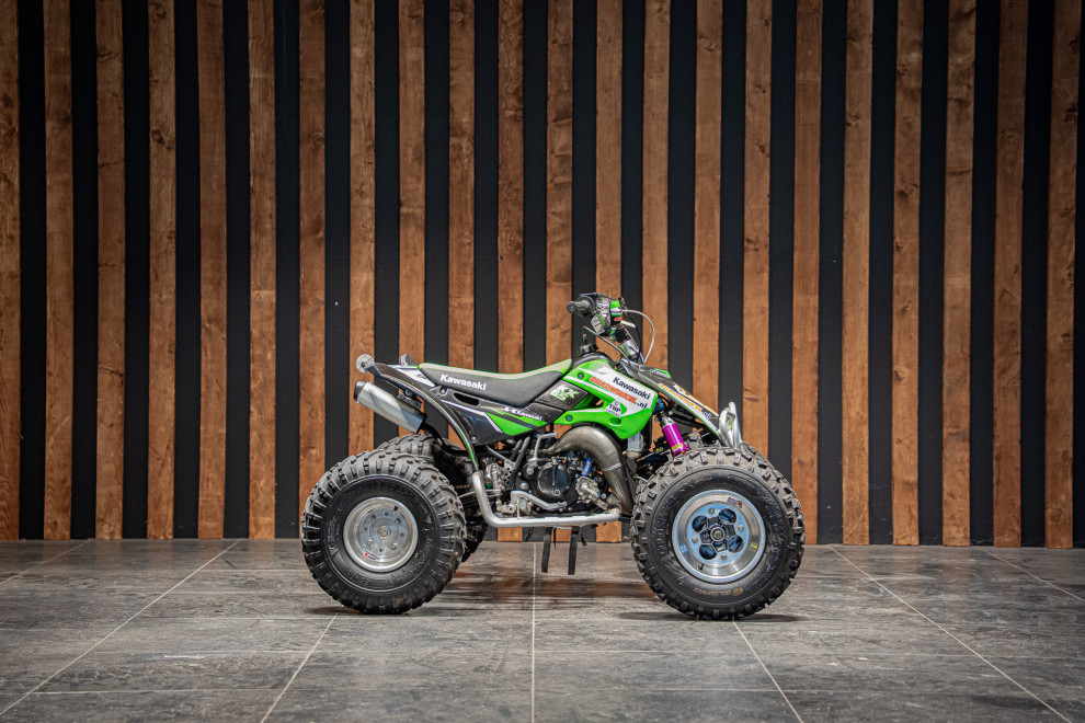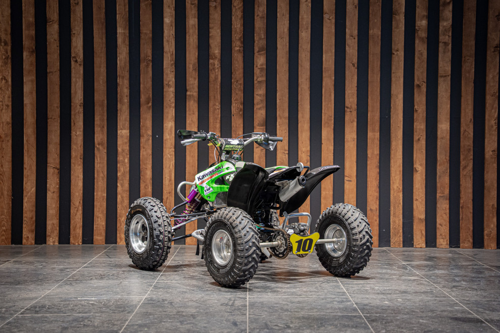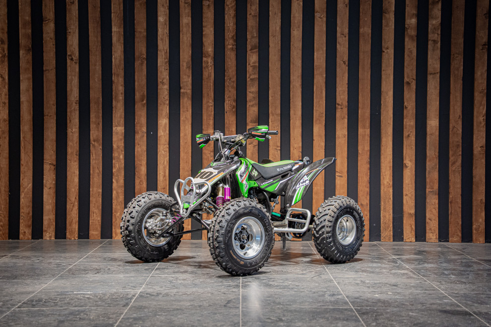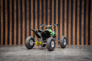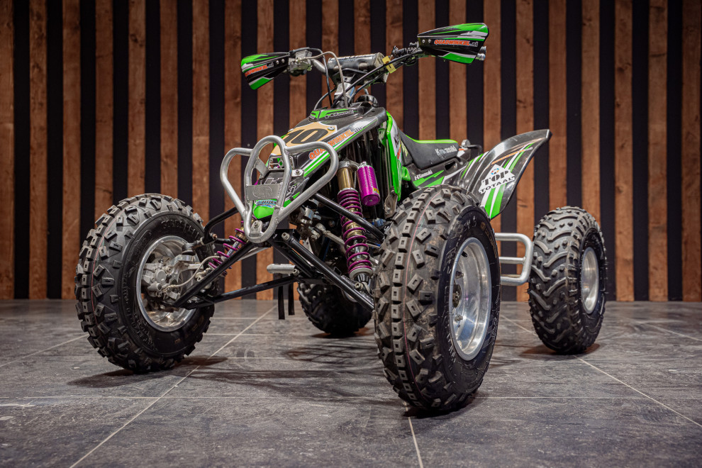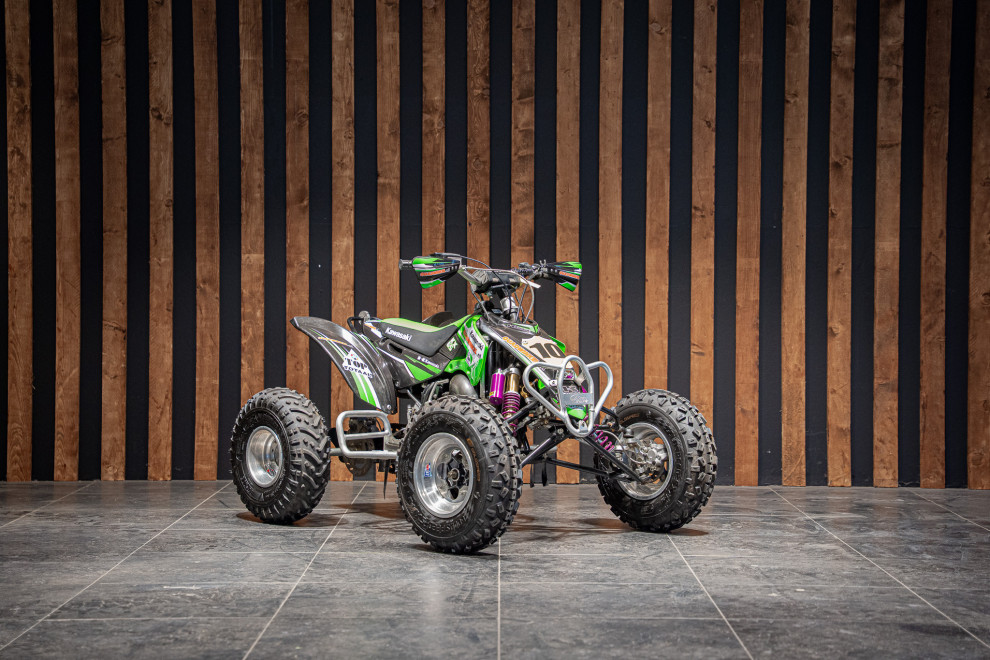 Deze volledig crossklare Kawasaki quad is een absolute blikvanger met zijn agressieve design en hoogwaardige afwerking. Uitgerust met premium Reiger veren, biedt deze quad uitzonderlijke demping en wegligging, zelfs op de meest uitdagende terreinen. De combinatie van robuuste terreinbanden, een versterkt frame en sportieve stuurafwerking maakt hem ideaal voor zowel recreatief gebruik als intensieve cross-sessies