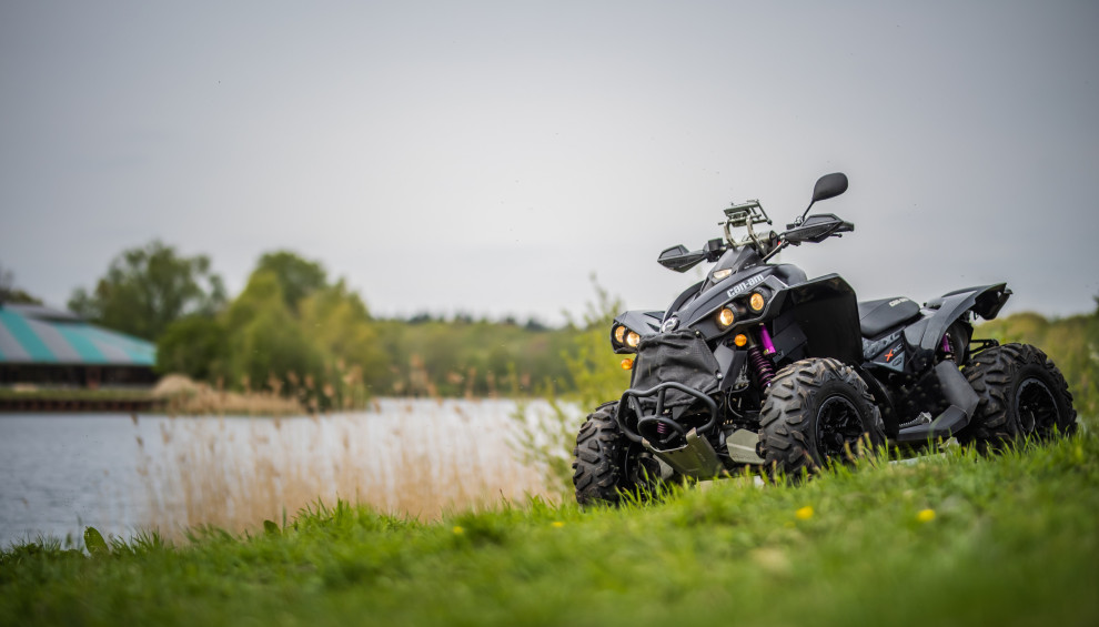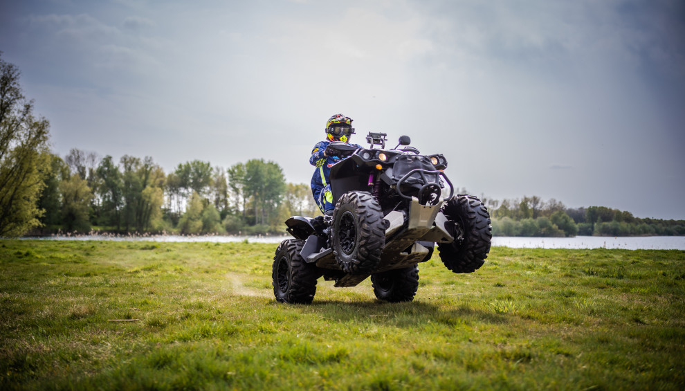 Na de aanschaf van die eerste Eton Vector 250 cc mét aanhanger sloeg het quadvirus genadeloos toe, vertelt hij lachend. “Het was superhandig voor de paarden, maar mijn kinderen en ik waren niet van dat ding af te slaan. We gingen er vaak mee rijden. In de winter bonden we er een rij sleetjes achter met een lang touw. Of een surfplank waarop de kinderen en hun vrienden dan moesten zien blijven te zitten. Ontzettend veel lol hadden we ermee.”
